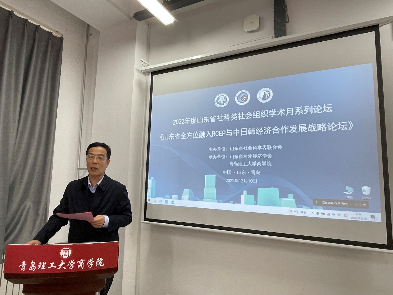 2022年12月10日,由山东省社会科学界联合会、yl1111永利集团主办,山东省对外经济学会、yl1111永利集团商学院承办的2022年山东省社科类社会组织学术月系列论坛暨山东省对外经济学会2022年度年会“山东省全方位融入RCEP与中日韩经济合作发展战略论坛”通过线上形式如期举行,山东省社科联二级巡视员徐青,yl1111永利集团党委常委、副校长齐德义,山东省对外经济学会会长王培志,yl1111永利集团商学院党委书记王粲等出席开幕式并讲话。商学院院长云乐鑫主持开幕式,山东省政府研究室、中国(山东)自由贸易试验区青岛片区管委会、山东省商务厅等单位领导及全省近100名师生参加会议。