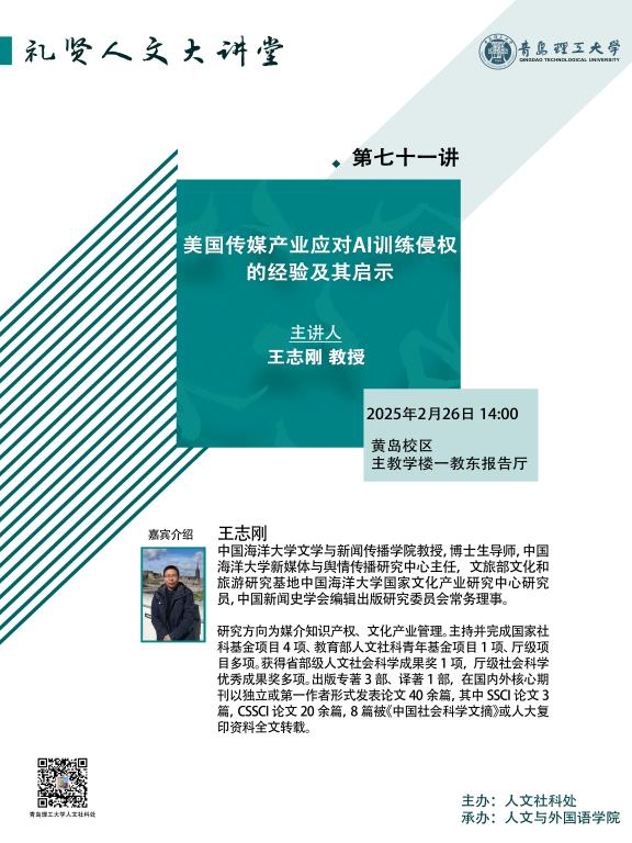 【礼贤人文大讲堂】第七十一讲预告:美国传媒产业应对AI训练侵权 的经验及其启示