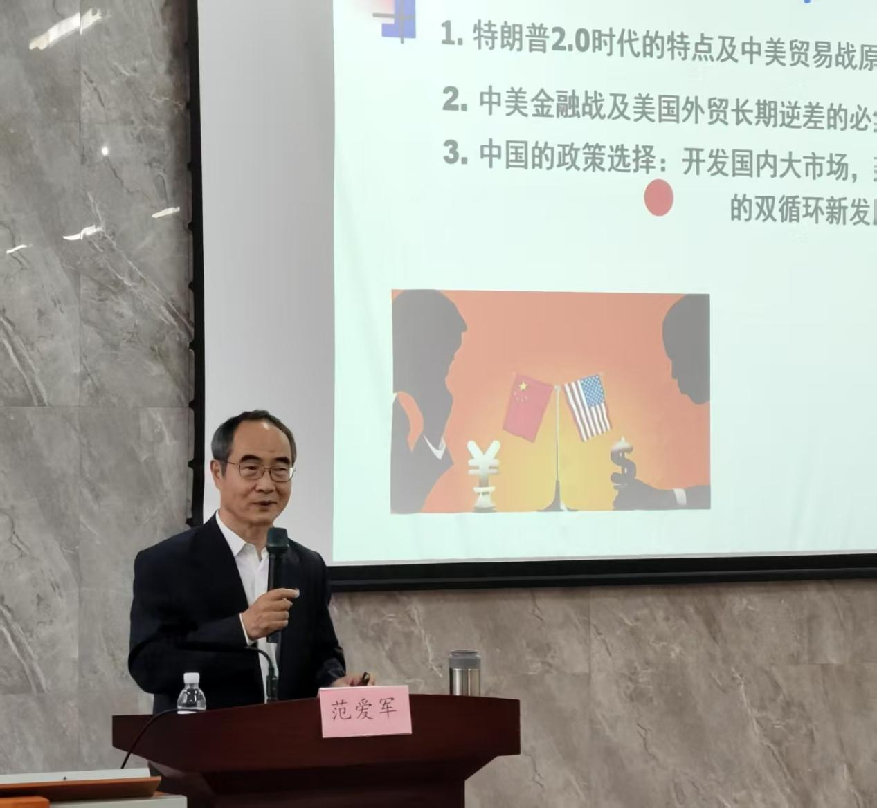 范爱军在讲座中深入分析了中美贸易战与金融战的新特点,探讨了中美贸易战爆发的深层次原因及美国外贸长期逆差的必然性,阐述了我国应对挑战的政策选择。他强调,面对复杂多变的国际经贸环境,中国要充分挖掘国内市场潜力,以国内大循环为主体,推动经济高质量发展。