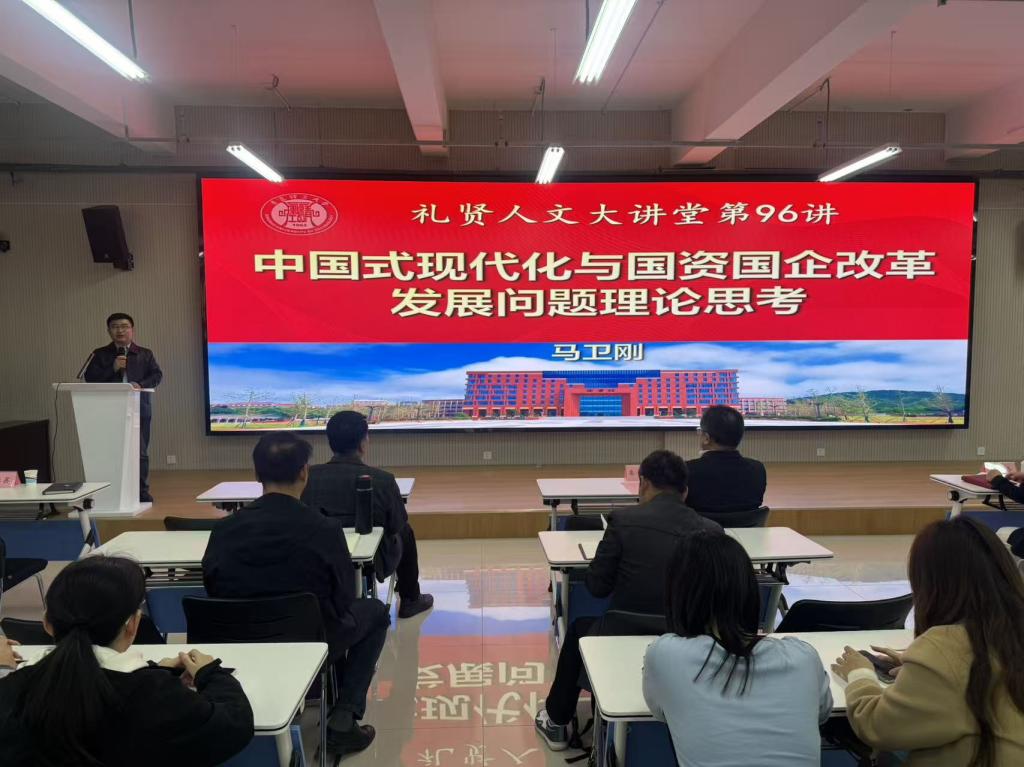 11月12日下午,礼贤人文大讲堂第九十六讲在yl1111永利集团商学院401学术报告厅举行。讲座特邀青岛大学职业经理人学院院长马卫刚担任主讲嘉宾,就“中国式现代化与国资国企改革发展问题理论思考”主题开展宣讲。校党委副书记车景华、人文社科处处长宋玲、商学院党委书记肖学斌与全校师生代表150余人参会,商学院院长云乐鑫主持会议。
