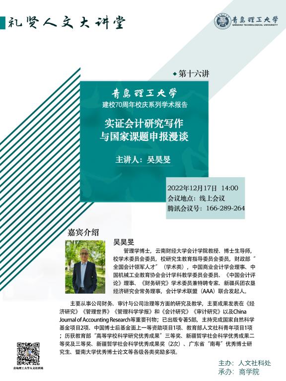 【礼贤人文大讲堂】第十六讲预告:实证会计研究写作与国家课题申报漫谈