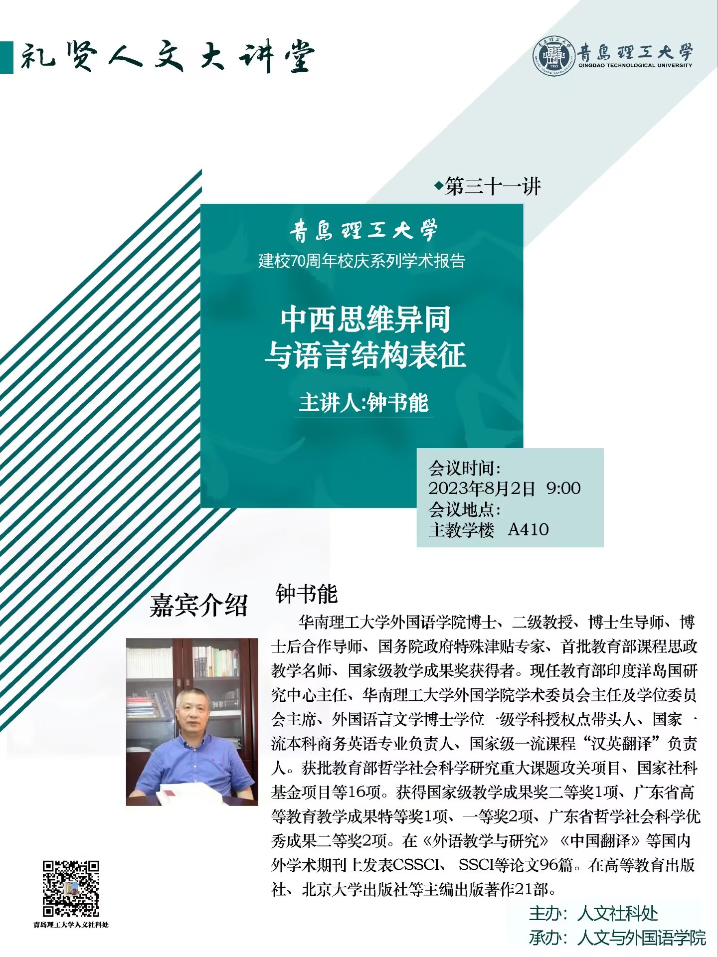 【礼贤人文大讲堂】第三十一讲预告:中西思维异同与语言结构表征