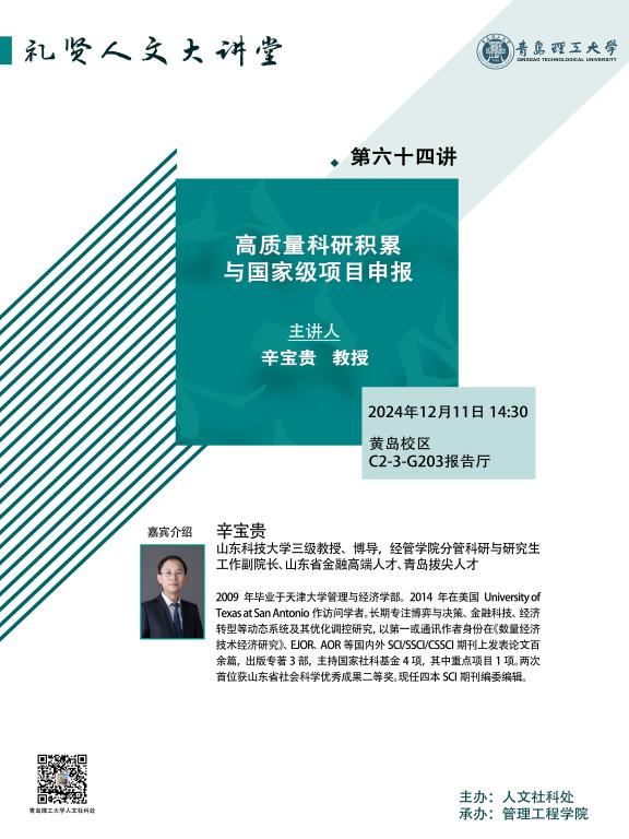 【礼贤人文大讲堂】第六十四讲预告:高质量科研积累与国家级项目申报
